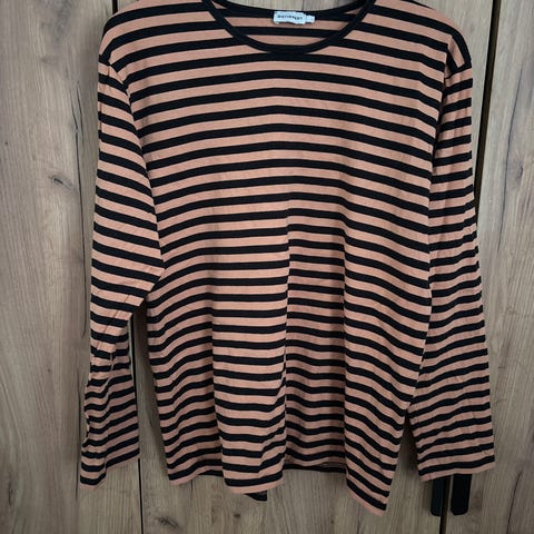 Pehmeä marimekon raitapaita koossa L. Pieni huomaamaton reikä toisessa helmassa, näkyy kuvassa ja on huomioitu hinnassa.
