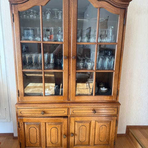 Vitriinikaappi, jossa kaksi lasiovea ja puurunko. Sisällä on useita hyllyjä esineiden säilytykseen ja esillepanoon. Alhaalla on kaksi vetolaatikkoa pientavaroiden säilytykseen. Kaappi soveltuu esimerkiksi astioiden, koriste-esineiden tai kirjojen säilyttämiseen olohuoneessa, ruokailutilassa tai muussa asuintilassa.
