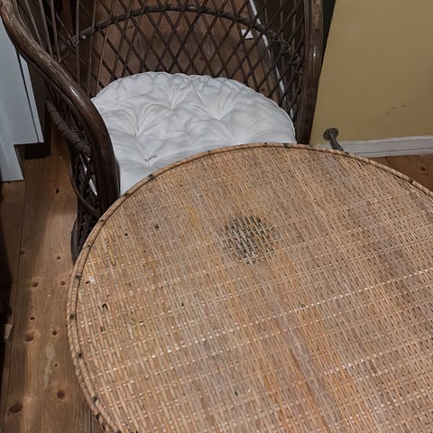 Vakaa ja käytännöllinen pöytä. Pöytälevy on puuta, pöydän jalat metallia. Se on ollut lasitetulla parvekkeella. Pöytälevyssä on muutamia tahroja.