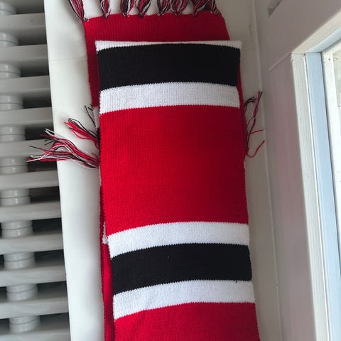 Kuvanmukainen Manchester United -huivi. Ei ihan uusinta mallia ja vähän nukkaa jo löytyy, mutta ehjä.