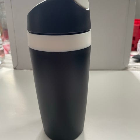 Käytetty, hyväkuntoinen tupperwaren termosmuki, käytön jälkeä on