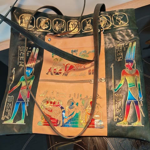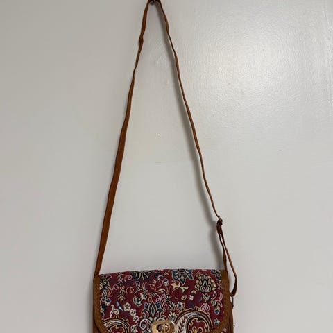 Itämainen olkalaukku naisille. Materiaalina kangas monivärinen kuviollinen pinta ja ruskeat reunukset sekä hihna. Laukussa on läppä ja metallinen kiinnitys edessä. Sisäpuolella on päälokero ja edessä erillinen etutasku. Takapuolella on vetoketjutasku pienten tavaroiden säilytykseen. Säädettävä olkahihna mahdollistaa laukun kantamisen olalla tai poikittain vartalon yli.