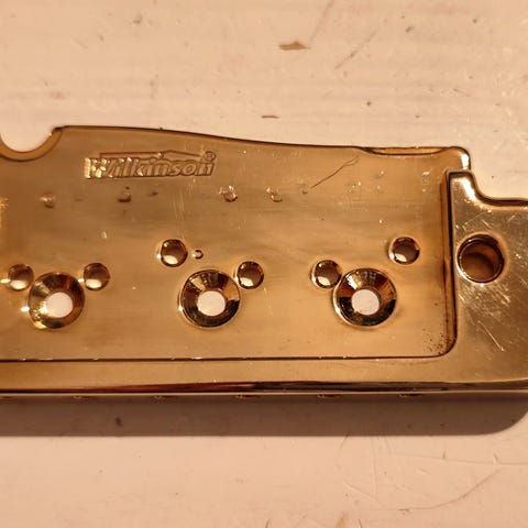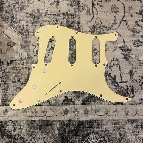 White 1-kerroksinen straton pickguard plektrasuoja kolmelle singlecoil mikrofonille. Tallamikrofonin ympärillä kolme jälkeä.