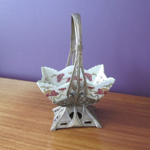 Vintage ( n. 30-luku) tarjotin, jossa käsinmaalattu kuva posliini/fajanssi laatalle, kromattu metallikehys ja kahvat.