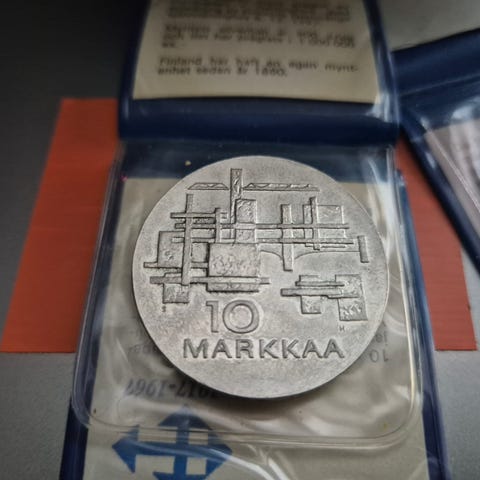 0.925 Ag hopearahat. Agricola,Nordenskiöld,Pehr Kalm. Suomen lippu 100v.,Pacius ja Minna Canth. 5 näistä 25.5g ja yksi 17g. Nouto Kotkasta tai postitus. Tässä hyvä setti keräilijälle.