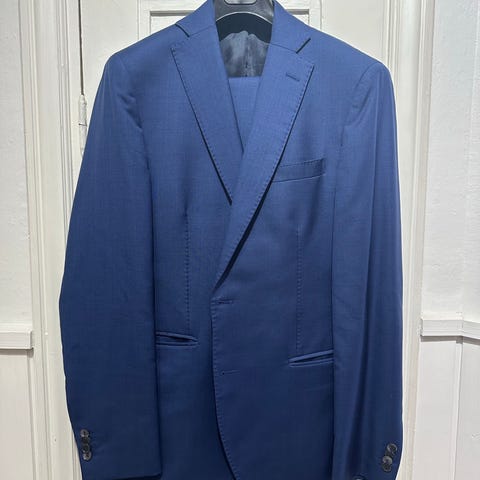 Sininen muutaman kerran käytetty italialainen villapuku, koko 52.