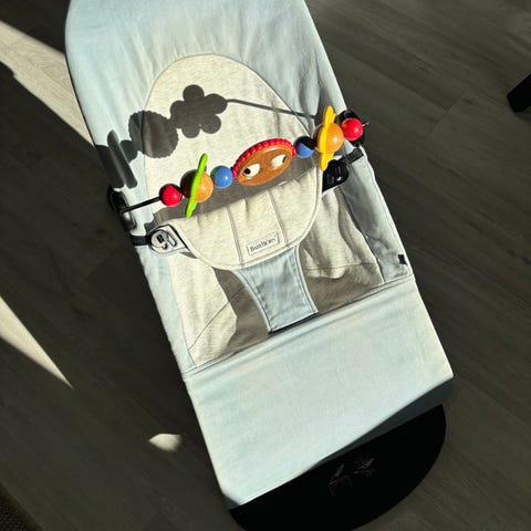 Myydään BabyBjörn Bliss Woven sitteri, sekä lelu Light Grey/Googly Eyes (pastelli).