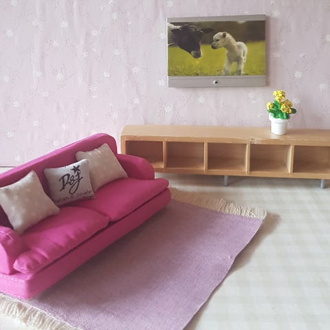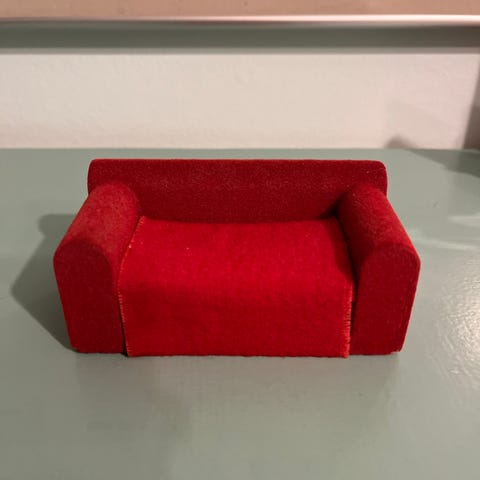 Lundby nukkekoti sohva ja nojatuoli 50-luvulta. Runko teakia, kangas vakosamettia. Molemmista puuttuu käsinoja, muuten ehjät.