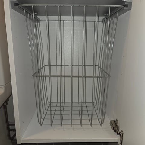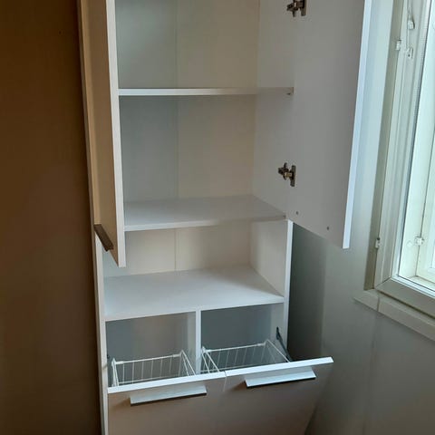 Ikean pyykkikaappi. Wanha pyyhekoukku sisältyy hintaan. Korkeus jalkojen kanssa 183 cm. Nouto Vallilasta. Käteinen tai Mobilepay.