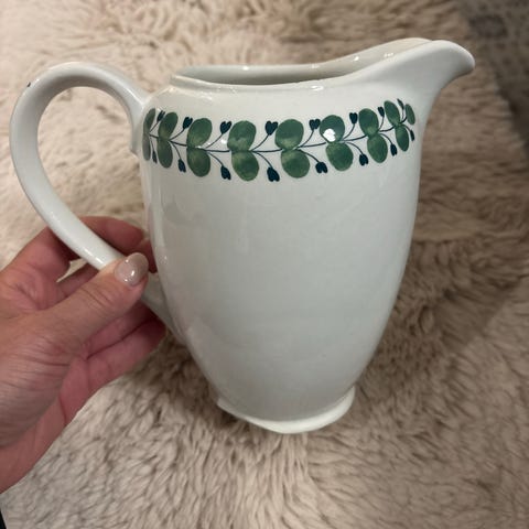 Arabia kannu, jossa valkoinen posliinipinta ja vihreä lehtikuvio kyljessä. Kannussa on kaatoaukko ja korvallinen kahva. Pohjassa Arabian leima ja mallinumero 2-71. Soveltuu esimerkiksi maidon, kerman tai kastikkeen tarjoiluun sekä osaksi kattausta tai kokoelmaa. Hintapyyntö 50€ / Tee tarjous