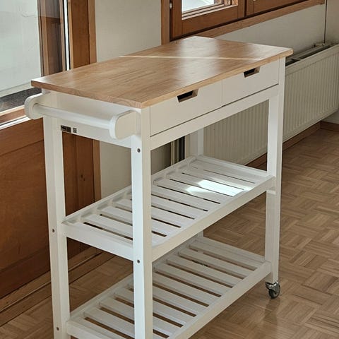 Myydään ok kunnossa oleva tarjoiluvaunu. Pöytä muuten hyvässä kunnossa, mutta ylätasolla haalistuma (kts. kuvat) sekä pientä kulumaa. Mustalla kalustemaalilla saisi varmasti peitettyä 😊