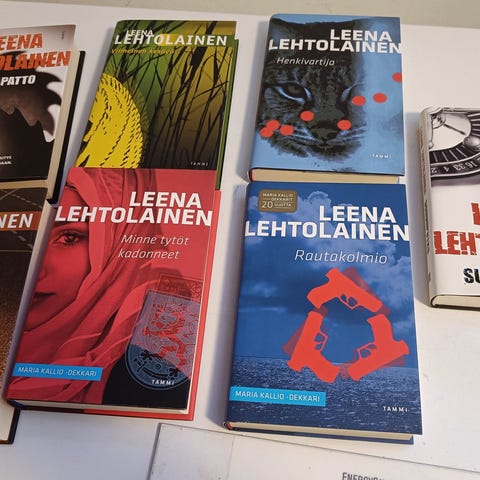 Myyn 9 kpl Leena Lehtolaisen Maria Kallio sarjan kirjoja (tai 10, mutta Kuolemanspiraalia on 2 kpl) + 2 kpl saman kirjailijan muuta tuotantoa. Kirjojen nimet näkyvät kuvassa. Kirjat on 1-2 kertaa luettuja ja parissa kirjassa on joissain sivuissa teksti vähän kulunut, mutta siitä saa selvän.