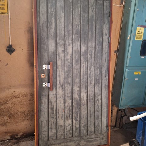 Ulkoovi karmeineen kahvalla ja lukolla.Avainta ei ole.