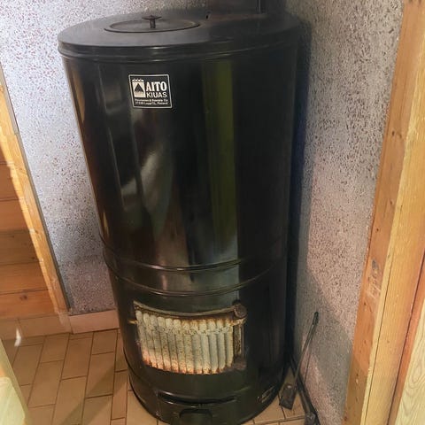 Muutama tulikivi on katki. Ei villoja eikä kiuaskiviä. Alaosan takasauma osittain ruostunut puhki (tämä on korjattava). Valmiiksi purettuna.