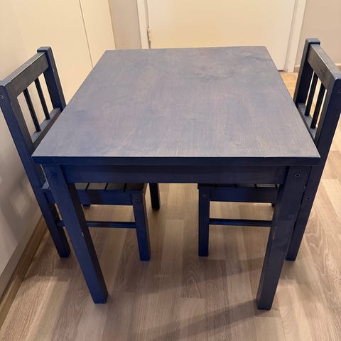 Pöytä ja tuolit ovat maalattu itse ja niissä on jonkin verran käytön jälkiä.
