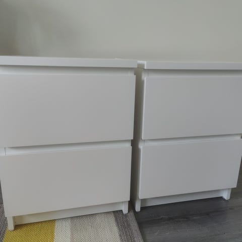 Kuvan valkoinen yöpöytä. Ei uusi, mutta ehjä.