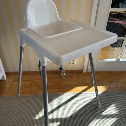 syöttötuoli, jossa pehmustettu kangasistuin mustavalkoisella kuosilla. Metallinen runko, jossa ristiin menevät jalat ja turvavyö lapsen kiinnittämistä varten. Soveltuu pienille lapsille ruokailuhetkiin ja muuhun istumiseen pöydän ääressä.