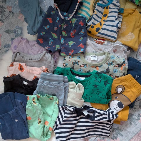 Siistikuntoisia vaatteita pojalle. Raitapaita 80, mutta mielestäni pientä mitoitusta.