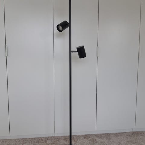 Monikäyttöinen musta lattiavalaisin, joka on kuin uusi. Usean taipuisan kohdan ansiosta lampun saa moneen muotoon. Sopii lukuvaloksi ja tunnelmavaloksi.