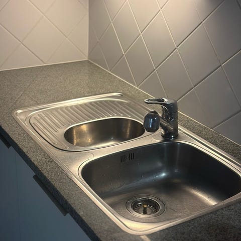 Keittiön teräksinen kaksoisallas leveällä tasolla