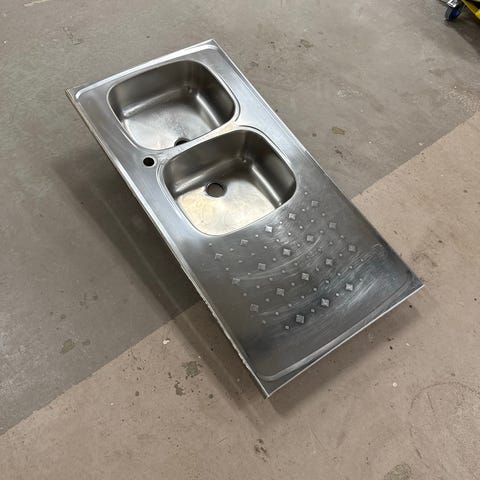 Keittiön teräksinen kaksoisallas leveällä tasolla. Altaassa on kaksi allasosaa ja yksi sekoitinhanalle tarkoitettu paikka. Materiaalina on ruostumaton teräs. Sopii keittiöön, kodinhoitotilaan tai esim. mökin kesäkeittiöön. Irroitettu rungosta.