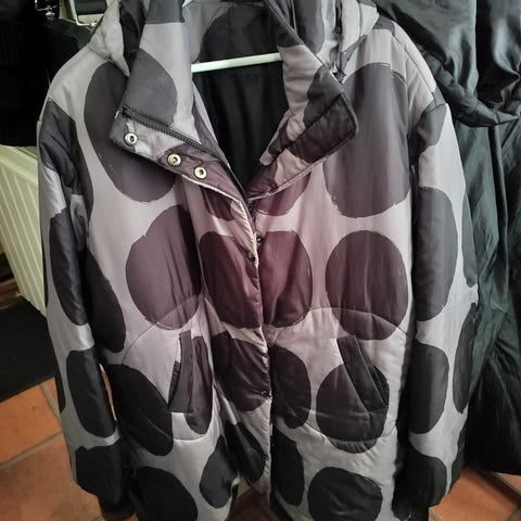 Marimekko naisten takki koossa XXL. Takki on vihma Kong jokeri. Takki on valmistettu pääosin puuvillasta ja siinä on sinivalkoinen, suurikuvioinen kuosi. Malli on väljä ja polvipituinen, edessä vetoketju. Hihansuissa on kuminauharesorit ja helmassa säätönyöri. Takissa on vuori. Sopii käytettäväksi ulkotakkina leudommilla säillä. Takkia käytetty 2 kertaa.