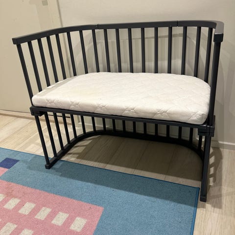 JLY sivuvaunu sänky. Leveys jaloista 60cm ja pituus 91cm. Patja mukana. Jaloissa pyörät. Laidan saa laskettua puolen väliin. Hyvä kunto ja ehjä.
