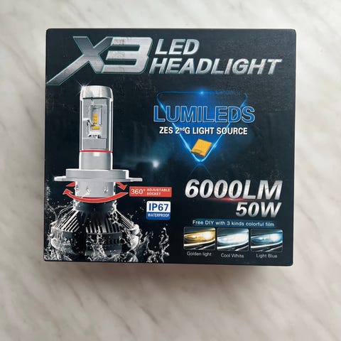 X3 LED Headlight ajovalopolttimot ajoneuvon ajovaloihin. Pakkaus sisältää kaksi LED‑polttimoa ja käyttöohjeen. Kanta H1