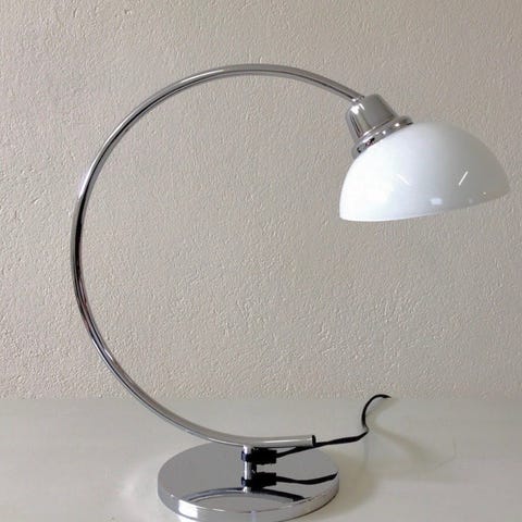 Kotimainen Lampukas-pöytävalaisin n. 1980-luvun alusta. Tehokas ja kätevä, rungon musta osa taipuu kaikkiin mahdollisiin ja mahdottomiin asentoihin; valon suuntaus toimii siis portaattomasti. Lampun varsi pääosin metallia, varjostin muovia. Valonlähteenä pieni mutta sisukas loisteputki, pistokkeena Helvar L11 DA -muuntaja. Virtajohdolla on mittaa parisen metriä. Valaisin on moitteettomassa alkuperäiskunnossa. Korkeus kuvissa 48 cm, maksimikorkeus varsi suorana n. 60 cm, paino n. 2,5 kg. Kotiinkuljetus järjestyy samaan hintaan Tampereella ja naapurikunnissa, lähetyskulut lisätään. Kysy!