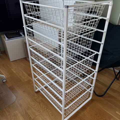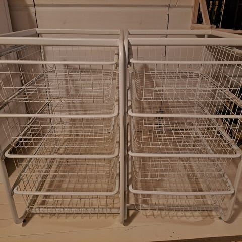 Metallinen korihylly 2kpl, jossa on useita erikokoisia koreja vaatteiden ja muiden tavaroiden säilytykseen. Valkoiset metallikorit ja tumma runko.