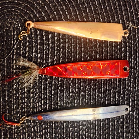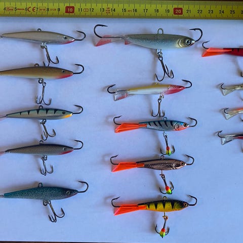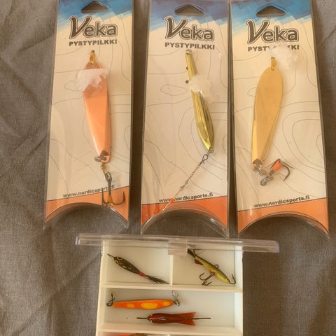 Pilkkisetti useita pystypilkkejä. Koukut teräviä. Vähän käytettyjä suurimmaksi osaksi. Hinta sisältää kaikki 13 kpl uistinta.