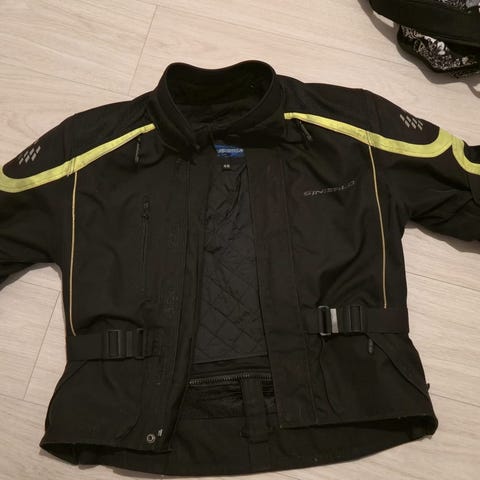 Course ajotakki, koko 40. Väri musta, edessä ja takana vaaleat heijastavat raidat. Takissa on vetoketjukiinnitys ja sisäpuolella vetoketjullinen tasku. Vyötäröllä on tarrakiristykset istuvuuden säätöön. Sopii moottoripyöräilyyn tai muuhun ajokäyttöön.