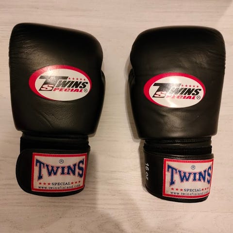 Twins Special nyrkkeilyhanskat harmaana värinä. Hanskoissa on tarrakiinnitys ranteessa ja paksu pehmuste rystysalueella. Sopivat nyrkkeilyyn ja muuhun kamppailu- tai kuntonyrkkeilyharjoitteluun.