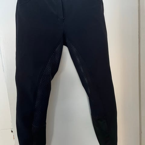 Naisten mustat ratsastushousut, joissa kokopaikka. Housuissa on pitävä, kuviollinen paikkamateriaali istuinosassa ja lahkeiden sisäpuoli. Sopivat ratsastukseen ja tallikäyttöön. Koko 44, vyötärö n. 86 cm.