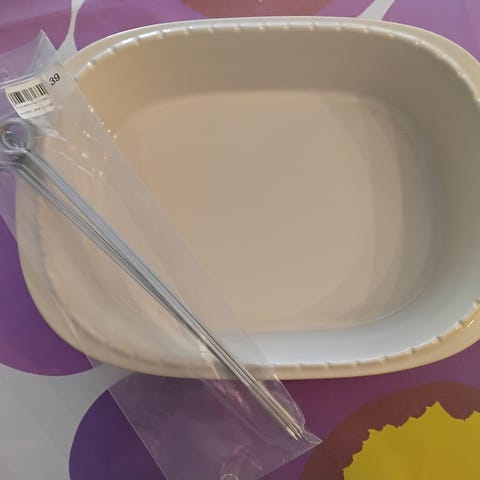 Käyttämätön uudenveroinen Kermansaven uunivuoka, väri keltainen, sisäosa valkoinen. Halkaisija ulkopuolelta 26 cm ja sisäosa n.22,5 cm. Korkeus vajaa 8 cm.