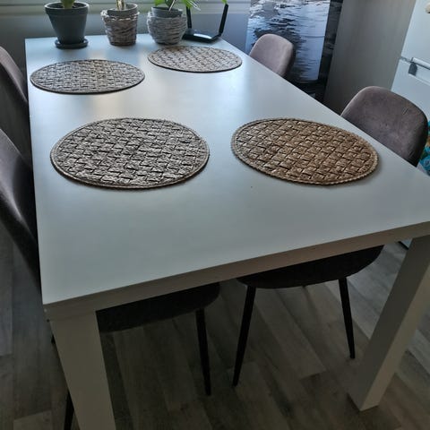 Valkoinen korkeakiiltoinen ruokapöytä koossa 90cm*180cm. Yleisilmeltään siisti, käytönjälkeä näkyy tarkemmin katsoessa. Yksi jalka on viritetty kiinni, Se on jokseenkin löysä. Pöytä on ollut tästä huolimatta käytössä. Tuolit eivät ole myynnissä. Haku Raisiosta paikan päältä.