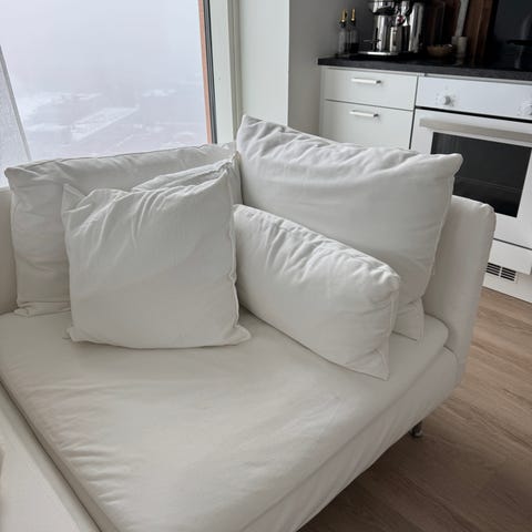 Tilanpuutteen vuoksi myyntiin Ikean Söderhamn sohva vaalealla kangasverhoilulla ja Prettypegs jaloilla (CARL230 Walnut, ovh 4 x 22,90 € ), jolloin istuinkorkeus noin 45 cm normaalin 40 cm:n sijaan. Vanhat jalat saa mukaan.