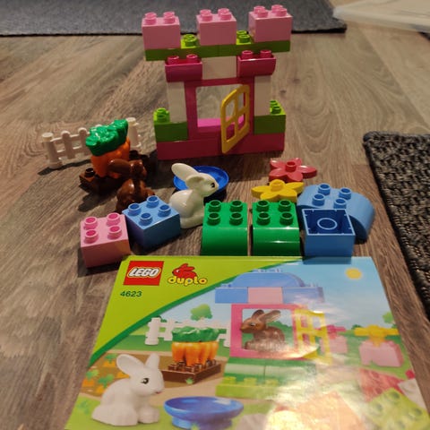 Lego Duplo lelusarja, jossa on pieni kokoelma Duplo-palikoita ja hahmoja. Kuvassa näkyy ihmishahmo, pandahahmo sekä muutamia peruspalikoita ja kukkapalikka. Sopii yhteensopivaksi muiden Lego Duplo -sarjojen ja -palikoiden kanssa sekä pienten lasten rakenteluleikkeihin.
