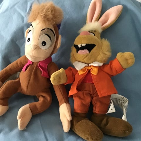 Vintage, 1990’s Disney Scooby-Doo pehmolelut. Pakettiin kuuluu kaksi ruskeaa Scooby-Doo -hahmoa, joista toisella on sininen kaulapanta ja toisella punainen univormuasu ja hattu. Pehmolelut on valmistettu pehmeästä kankaasta ja sopivat lasten leikkeihin tai koristeeksi. Hahmoissa on yksityiskohtaiset kirjailut ja täytetty rakenne, joka pitää muodon leikeissä. N. 25 cm pitkiä.