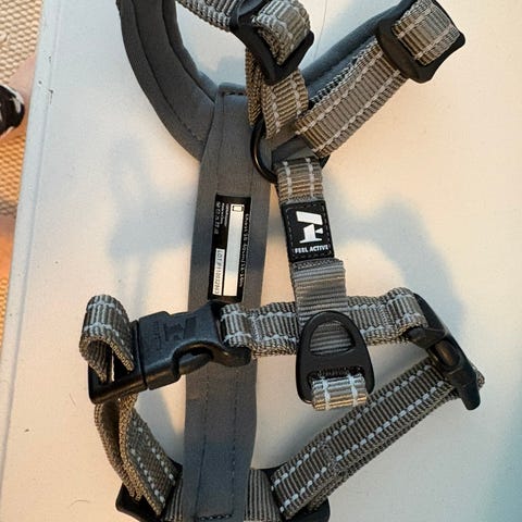 Käytetty mutta hyvässä kunnossa olevat koiran valjaat. Lapun mukaan rinnan ympärys 68-82cm. Oli noutajanartulla käytössä.