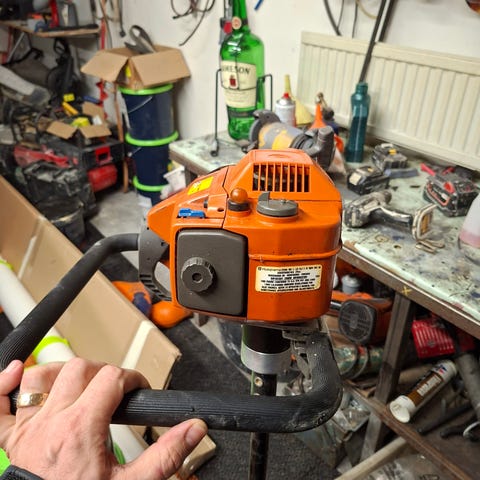 Hyväkuntoinen 6" polttomoottorikaira. Varaterät mukaan.