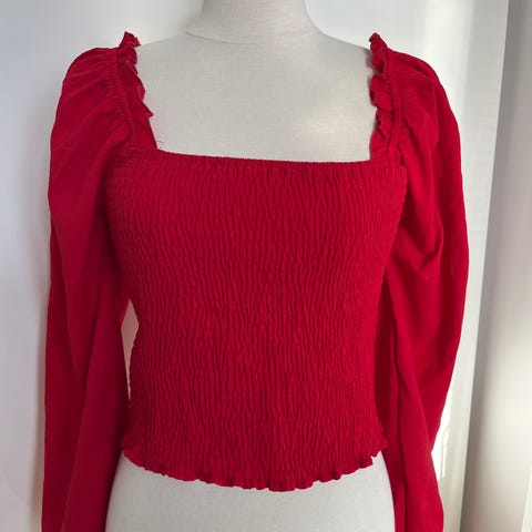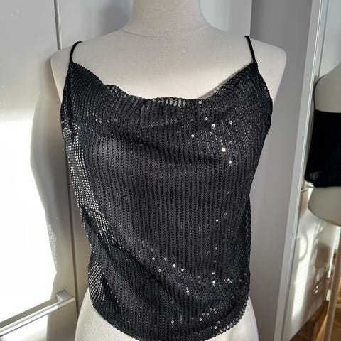 Shein olkaimeton toppi naisille, koko M. Tummansininen väri. Topissa on useita kerroksellisia röyhelöitä ja korkeahko kaulus, joka kiinnittyy niskan taakse. Selkäosa on avoin. Materiaali on kevyttä, läpikuultavaa kangasta (päällinen ja vuori synteettistä kuitua). Sopii käytettäväksi esimerkiksi juhla- tai iltatoppina hameen tai housujen kanssa.