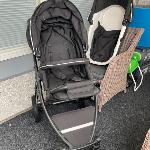 Ratasosan renkaan kiinnitys rikki ja samoin työntöaisan kangas. Ks.kuvat. Mahdollisesti korjattavissa olevia tai sitten varaosisksi muita osia.
