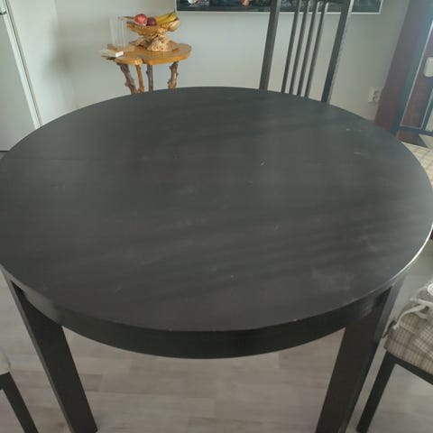 Pyöreä pöytä ja neljä tuolia. Pöytä on valkoinen ja valmistettu puusta. Tuoleissa on valkoinen puurunko sekä pehmustetut istuimet ja selkänojan keskiosa kuviollisella verhoilukankaalla. Kalusto sopii esimerkiksi keittiöön tai pieneen ruokailutilaan.