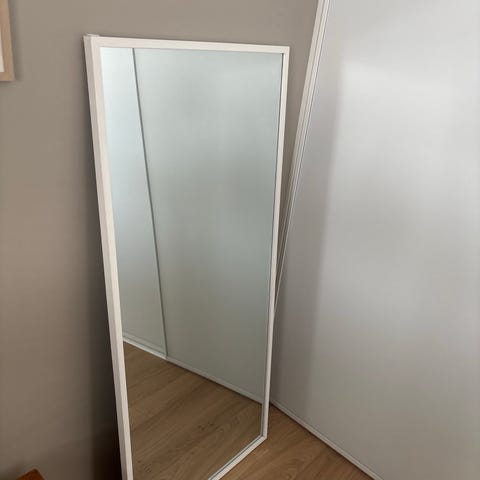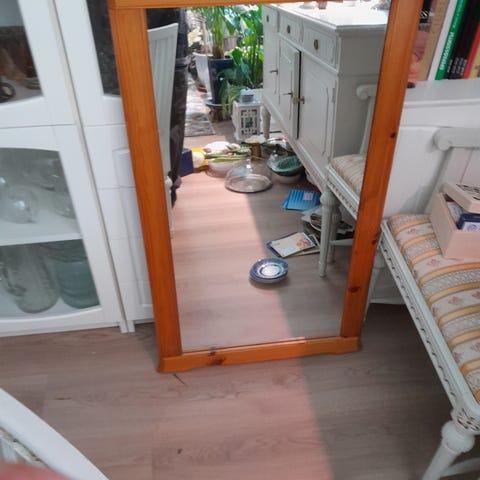 Kokovartalopeili, jossa vaalea puinen runko ja jalusta. Peiliosa on soikea ja sitä voi kallistaa sivuilla olevien kiinnikkeiden avulla. Sopii esimerkiksi makuuhuoneeseen tai eteiseen pukeutumis- ja tarkistuspeiliksi. Rungossa sorvatut jalat ja tausta levymateriaalia.