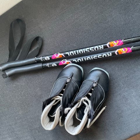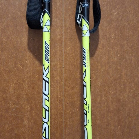 Fischer hiihtomonot ja hiihtosauvat lapsille. Lasten hiihtosauvat, joissa muoviset sommat ja rannelenkit. Sauvojen pituus 80 cm. Monojen koko 31.