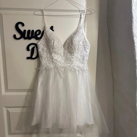 Laona juhla- tai rippimekko, koko 32. Mekko on vaaleanpunainen ja siinä on lyhyt, kellomainen helma. Yläosa on koristeltu pitsimäisellä kirjailulla ja pienillä koristekivillä. Mekossa on olkaimet ja kevyt, kerroksellinen alaosa. Sopii juhla- ja tilaisuusmekoksi.
