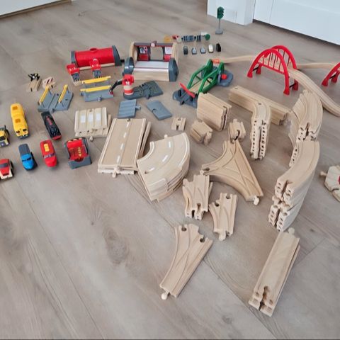 Hyväkuntoinen Brio-junaratasetti. Muutama Habe tuote joukossa.