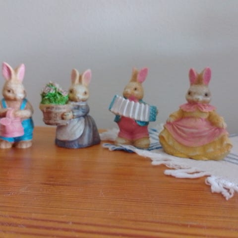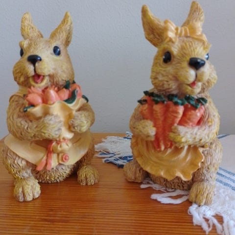 Hartsivalutyöt x 2 pupua. Maalattu akryylimaalilla, lakattu vielä kiiltävällä lakalla. Maalia irronnut toisen pupua pohjasta.