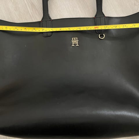Tommy Hilfiger laukku. Ostettu uutena eikä ole sitten ikinä tullut käytettyä. Materiaalina musta tekonahka, jossa kohokuvioitu TH-logo kauttaaltaan. Laukussa on pitkät olkahihnat ja vetoketjukiinnitys. Sisäpuolella 1 avotasku ja 1 vetoketjutasku pienten tavaroiden säilytykseen. Soveltuu arkilaukuksi ja mukaan mahtuu esimerkiksi tietokone, asiakirjoja ja muita päivittäisiä tavaroita.